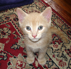 Big Giant Head This male ginger kitten is gonna be a big adult from the looks of him. His head is really big, and his eyes are set farther apart than usal (which makes him a little wall-eyed now). But from the size of his skull and his paws, I'd say he's setting the stage to be one big boy when he grows up. Despite his gargantuan size, he's a bit of a momma's boy but is as playful as the others.