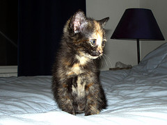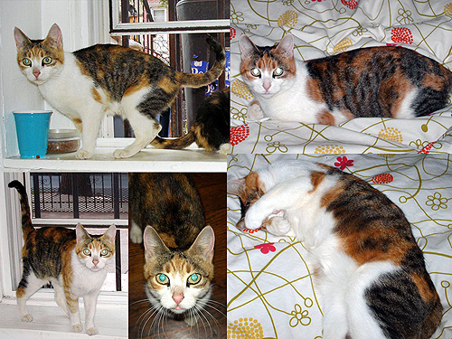 I've compiled new photos into individual Flickr albums so you can get a clear picture of each one. Plus I've shot some more poorly-shot video of the kittens playing. This video showcases the female calico kitten at the beginning: tell me you don't want to take her home after her little hind-legs move: