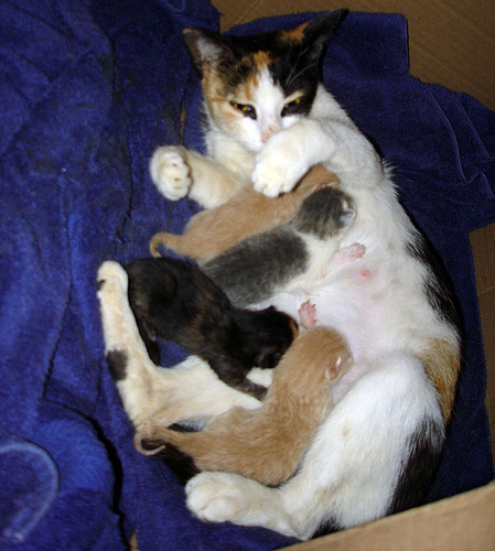 So did you know that there's a placenta for each kitten? It's kind of disgusting! Luckily the Moms cut the cords and disposed of everything that wasn't cute and fuzzy. None of the kittens look like her, there are orange tabbies, a gray and white tabby, and a black-orange mottled kitten. It seems odd that none came out in that standard calico-on-white pattern. We were hoping we would be able to tell who the father was by the kittens' markings, but they came out looking like several of the local Casanovas. I did read that it is possible for a female cat to get pregnant by more than one father at a time, but that's pretty rare. I'll have to research more about calico cats; I know about how there are almost no male calicos, but is it a recessive gene or something?