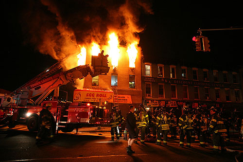 Check out that fire! If you look just to the right of the fire you will see my first Brooklyn apartment, the 3 windows on the 2nd floor. I don't think I ever ate at the Chinese restaurant, but there was a vent in the back that produced a greasy stench of old sesame noodles all the time, so I'm sure I absorbed some of that. Plus the Mr Softee truck would double park outside every day during the summer and play that damn song for 20 minutes while the driver waited for his order. I wonder what it looks like in that apartment now, it was pretty lousy when we lived there, and I wasn't proud of the state in which we left it. The mind reels at what kind of rent it commands now, it was $1300 in 2000. We shoved 3 people (and at times, 4) into this place; it is of note that none of these former roommates are in close contact anymore. But it helped me get my footing here (come to think of it, we rented it sight unseen, guess it coulda been worse).  I'm rather under the weather, but I still expect to finish much more of the basement this weekend. Aside from taping the seams in the ceiling, our biggest challenge will be moving the remaining 12 panels of sheetrock into the cellar. What fun that will be. Sheetrock has to be one of the most frustrating building materials ever devised by man. Most supplies are straightforward; plywood, 2x4's, nails. They are what they are. But drywall has some very odd properties. It is de rigeur for the interiors of most houses, yet it's pretty delicate and can be damaged easily. It's heavy and unwieldy, but a screw can ravage it if it breaks through the outer paper layer. It's very dense but it can be cut and split using a boxcutter. I got some patching pieces to fit by literally filing down the sides, producing a horrendous amount of dust. When the drywall was delivered, many of the panels sustained damage (before Buzz and I even got our hands on it). There were strap indentations, some corners were crushed, some had paper torn off. Any little thing that happens to it can greatly reduce its structural integrity (Just try smashing a small part of a panel and see how easily the rest of it crumbles). But in theory it can all be made right again with a few dabs of joint compound, which, near as I can figure, is just a pail of liquefied drywall. What an amazing product. Labels: House, Renovation, Soundproofing
