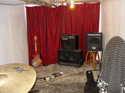 Look at that lovely floor! Despite still having some loose ends (more wall work to do, no latch on the door), we hooked up the rig and went to town, musically, last night. The verdict: not bad! Sound isolation is better than I anticipated. Well, actually, when we began this project I envisioned a completely soundproof space, wherein a man could cut sheet metal with a rusty circular saw at 2 in the morning and have no fear of annoying a soul. But as the work progressed I realized that the reality of things would be a bit less dramatic. But I started thinking all this work wasn't gonna amount to anything except a rather cramped and stuffy practice space, with bass frequencies reverberating through the house and into angry neighbors' domiciles.